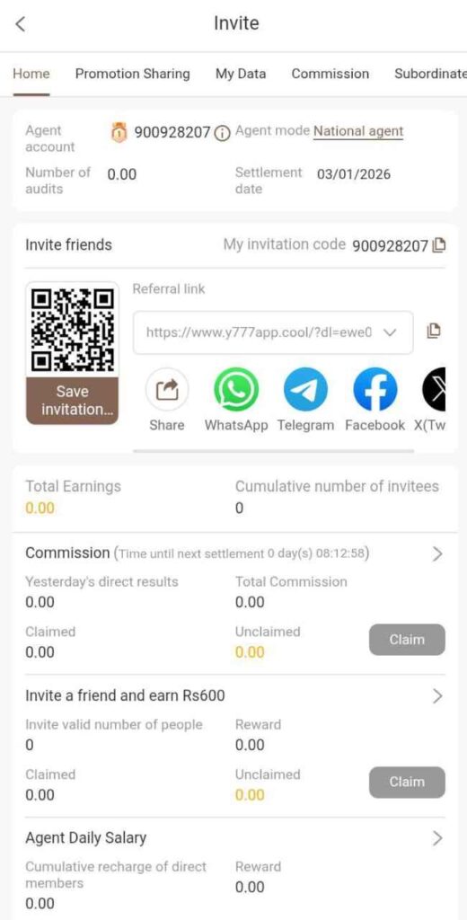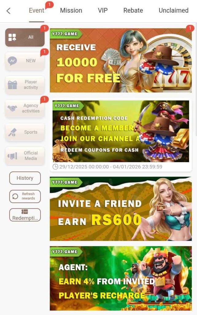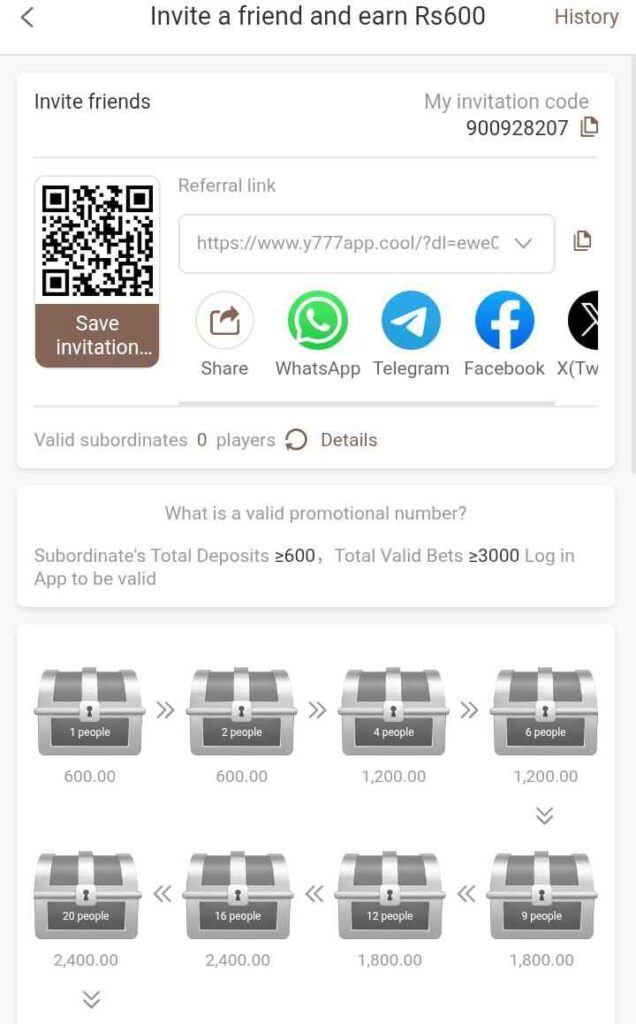 The Y777 referral program allows users to earn by inviting new members.