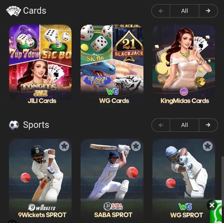 For sports enthusiasts, the platform offers betting options on 9wickets, FB Sports, and more. Additionally, you can enjoy classic card games like Poker and try your luck with the Fish Lottry.